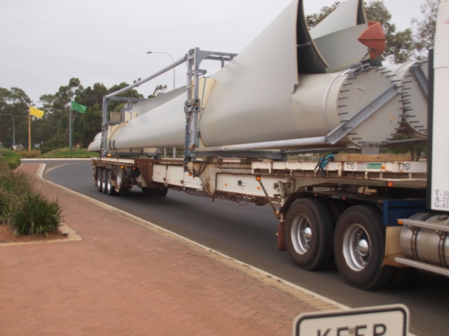 In addition, there is the top rear section of the nacelle and all three were loaded on a single semi trailer. Finally, six sea containers contain the transformers, switchgear and the lower rear farings of the nacelles were also trucked to site. |