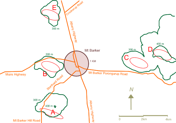 Contours of 300m above sea level or more are show above. There would appear to be five obvious sites, A, B, C, E and D. Another major consideration is the grid, there is a substation at Mt Barker.